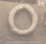 Auf dem leider nicht datierten Foto hat sich ein Teil der Besatzung zur Gruppenbild mit Hund zusammengefunden. Schön ist auch hier die am Schornstein montierte Schiffsglocke des Bootes zu sehen. An der Brücke – neben dem Steuerbord-Positionslicht – hängt ein Rettungsring des Bootes. Die Aufschrift besteht aus dreidimensional gestalteten, weißen Buchstaben. Aufgrund der Aufhängung scheint der Rettungsring auch schon etwas seine runde Form verloren und sich etwas in die Länge gezogen zu haben.